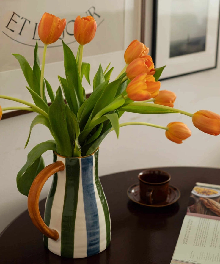 This hand-painted ceramic jug features a captivating striped pattern in refreshing blue and green hues, complemented by an orange handle. The organic shape adds an artisanal touch, making it perfect for your table setting serving water, juice, or even showcasing your favorite flowers.